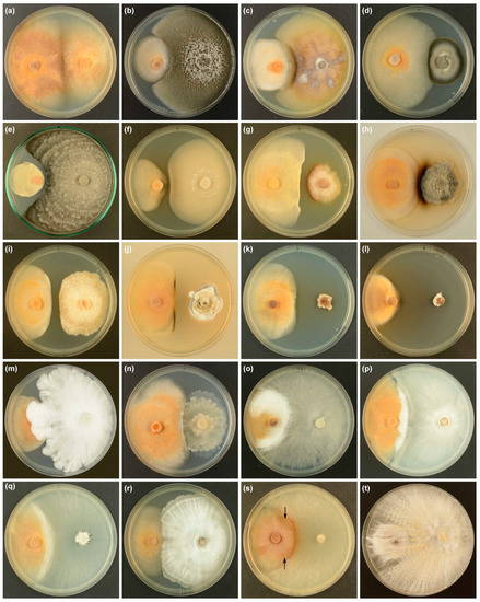 Three types of interaction (A, B, C) were observed on MEA in dual-culture assays with either of two isolates of H. fraxineus, originating from two stands of F. excelsior, and 117 fungal species representing 164 morphotypes, isolated from the previous year’s leaf petioles (Figure 9a–t and Table 4, Supplementary Material Table S1). The fourth type (D) listed in Methods did not occur (Table 4, Supplementary Material Table S1). The types occurred with different frequencies. Types A and B were significantly more frequent than type C (Table 4). The difference in frequency between type A and type B was statistically non-significant. The frequency of any type did not depend on the H. fraxineus isolate used (Table 4). One species of test fungus was represented by 1–5 morphotypes (Supplementary Material Table S1). Differences in interaction type between different morphotypes of one species were sporadic and often temporary, e.g., D. acicola FeF42 had an inhibition zone only for the first 3 weeks, then covered the zone and finally had an effect similar to that observed with D. acicola FeF119 (Supplementary Material Table S1).