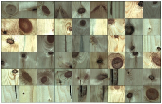 Using the image acquisition system in Figure 1, we have obtained more than 5000 pieces of 300 × 300 pictures of solid wood panels with defects. These defects mainly include six characteristic defects such as dead-knot, live-knot, decay, mildew, crackle, and pinhole. Parts of the sample images collected are shown in Figure 2.