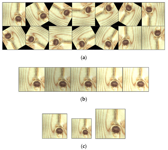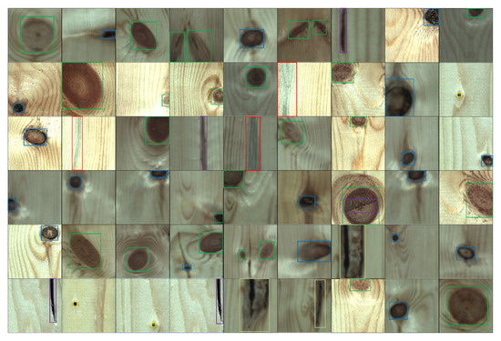 In order to enrich the sample data, data enhancement has been carried out on the sample pictures, which have been obtained to meet the requirements of network training and avoid overfitting. According to the characteristics of solid wood panel images, the data enhancement process is implemented in the following three ways: (1) on the basis of ensuring the invariability of rotation and tilt of defect images, rotate defect images by different angles, and mirror the image based on horizontal and vertical directions; (2) adjust the brightness and saturation of defect images to simulate images taken under different lighting conditions; (3) randomly scale the defect image, 0.8 and 1.2 scales were selected. Through data enhancement, the original data set is expanded by 20 times so that the training sample data reaches more than 100,000 pieces. As shown in Figure 3, the defect image data of a solid wood panel is expanded. Then the obtained sample pictures are manually labeled. Parts of the labeled pictures are shown in Figure 4.