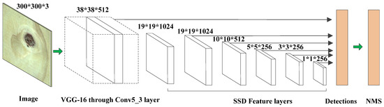 Liu [26] proposed an SSD network algorithm. The basic network of the SSD network model is VGGNet (Visual Geometry Group) [27]. The SSD model constructed in this paper includes the first five layers of the VGG16 network, an SSD feature mapping layer, a feature detection layer and NMS (non-maximum suppression) module, as shown in Figure 5. The first five layers of the VGG16 network are used for feature extraction. The SSD feature mapping layers are composed of a multi-layer convolutional neural network. The SSD feature mapping layers are used to map the default border score and the default border bias information. The feature detection layer can map all prediction results. The NMS module can process all the predicted results and finally output the prediction results of the detection.