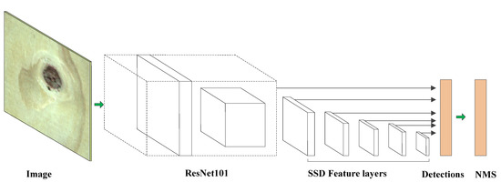 The application of a deep residual network can avoid the network degradation and precision decline caused by the increase in depth of the VGG network. It can also optimize the performance of the SSD algorithm and improve the detection speed and accuracy of the SSD model. After selecting the ResNet101 network to replace the VGG16 network, the original SSD network framework becomes the structure shown in Figure 7.