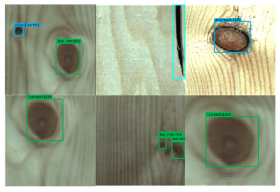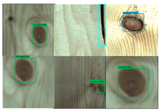 In this paper, the ResNet + SSD algorithm is designed to detect the surface defects of the solid wood panel. The SSD algorithm involves the predicted box mechanism. After the solid wood panel image passes through the network, the specific recognition comparisons of the above-mentioned SSD algorithm and the improved algorithm are shown in Figure 8 and Figure 9. Figure 8 is the recognition result based on the SSD algorithm. Figure 9 is the recognition result based on the ResNet + SSD algorithm. Compared with Figure 8 and Figure 9, the ResNet + SSD algorithm can detect the defects that the SSD algorithm can detect while detecting smaller defects and obtaining higher accuracy.