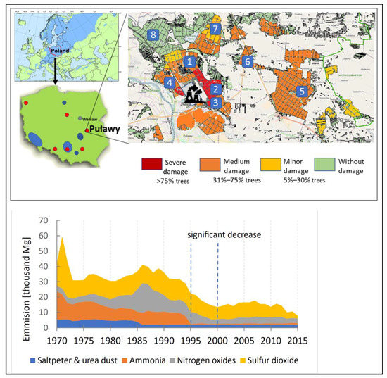 The nitrogen fertiliser factory in Puławy (Zakłady Azotowe Puławy) is located in central-eastern Poland (51°27′ N & 21°58′ E), in a region with prevailing westerly winds (Figure 2). The area had no significant air pollution prior to the launch of the factory. The industrial plant was built on the western edge of a large forest complex, in an area covered by oligotrophic habitats types, dominated by Scots pine, formed on sandy soils low in nutrients and suffering from periodical acute water deficits [45,50]. The facility was commissioned in the autumn of 1966, and the first signs of damage to pine stands were already observed in the early spring of 1967. In the same year, many trees died within an area of 70 hectares [41]. The zone of forest destruction kept rapidly increasing in size: within the next three years, an area of 500 hectares of the forest on the eastern side of the plant was completely degraded (with all trees being dead), creating a “biological death zone”. The extent of damage to tree stands in the remaining areas was varied, with more than 75% of dry or severely damaged trees in the most affected zone. From 1970 onwards, as the devastation of the environment progressed, the zones of destruction continued to expand outwards from the fertiliser plant. Currently, severely damaged forests (with more than 75% of trees affected) cover an area of 1200 hectares, and forests with moderate damage (31% to 75% of trees) and minor damage (5% to 30% of trees) cover approximately 500 hectares and 7000 hectares, respectively [50]. The amount of air pollutants emitted from the factory in the different years is shown in Figure 2 (bottom).