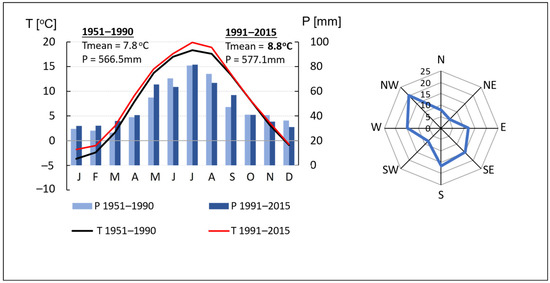 Climate diagram and wind rose for study area, constructed on the basis of data from meteorological station in Puławy for the years 1951–2015.
