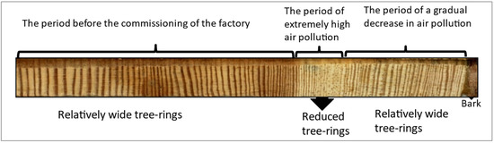 To assess the pollution stress in trees, many biochemical, physiological, and morphological methods are used [14,15,16,17,18,19,26]. Among the morphological methods, the most common approach is tree-ring analysis [27,28,29,30,31,32,33,34,35]. A retrospective analysis of annual ring widths and other tree-ring parameters (e.g., chemical composition of the wood, stable isotopes) makes it possible to obtain information on the state of the environment at a high time resolution. Hence, tree rings are often used to assess the long-term effects of air pollution in the environment [29,30,31,32,33,34,35,36,37,38]. These studies have indicated that trees growing in a polluted environment have narrower increments or, in extreme cases, do not produce any increments in a given year [36,37,38].