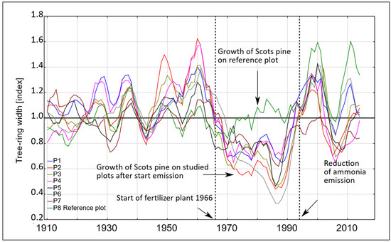 Our dendrochronological analyses have indicated the existence of significant and prolonged reductions in the annual ring widths of the Scots pine trees growing in all the forest stands under study (Figure 5). This points to a persistent, chronic decline in the vitality of the trees being examined. The decline began in the late 1960s, following the commissioning of the nitrogen fertiliser plant, which is when the pollutant emissions began. Reductions occurred in a majority of the trees under study (Table 1), although they were differentiated spatially and temporally.