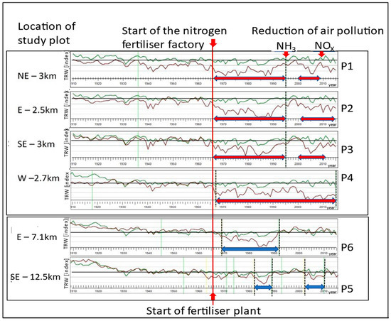 Reductions in the radial growth of the Scots pines growing in the vicinity of Zakłady Azotowe Puławy (selected plots). Explanation of markings: Brown lines—pine chronologies on research plots, green line pine growth on the reference plot. Red horizontal arrows indicate the period of word reduction on surfaces located in the zone up to 3 km from the factory, blue arrows indicate the period of reduction in rings on surfaces located further from the factory. Vertical green lines indicate which the period to be taken into account when calculating the rate of growth reduction, reduction, following the Schweingruber method [59], e.g., diagram P1—the reduction period lasts from 1967 to 1995 (28 years), hence the preceding period 1938–1966 was used for the calculation of the reduction rate. See explanation in the text, methods section.