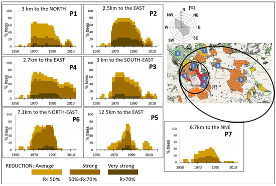 The spatial and temporal distribution of the growth reduction between the different study plots is shown in Figure 7 and Figure 8. This distribution points to a clear relationship between the size of the reduction on the one part and the distance from the emitter and the prevailing wind direction on the other. Within a radius of 3 km from the source of the emissions, reductions in growth occurred almost simultaneously in a majority of the trees being studied (66.7% to 88.1%); the reductions lasted for many years and were strong or very strong (above 50%). The largest share of trees showing a very strong reduction in growth (above 70%) could be found in plot 2, which is located approximately 2.5 km east of the emitter, whereas the pines growing in the northern part of the zone (plot 1) showed a lesser degree of reduction. In the stands located further away from the emitter, the extent of damage to the trees generally decreased with distance from the emitter. However, trees growing in stands located in the prevailing downwind direction were affected more severely than those growing at a similar distance from the factory but located to the north of it (Figure 7).