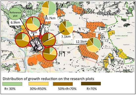 In comparison with forest complexes growing near other nitrogen factories in Poland, the reductions in tree-ring width and the damage to pine stands in Puławy were much greater [30,62]. A similar degree of damage can be observed in forests growing in Silesia, which is the most polluted region of Poland. There, however, the negative effect of air pollution was more prolonged and the amount of pollution was significantly greater [36,63,64]. For that reason, we decided to search for an answer to the question of what other factors—apart from the excessive emissions of toxic substances—could have caused such reductions in growth and determined their spatial distribution.
