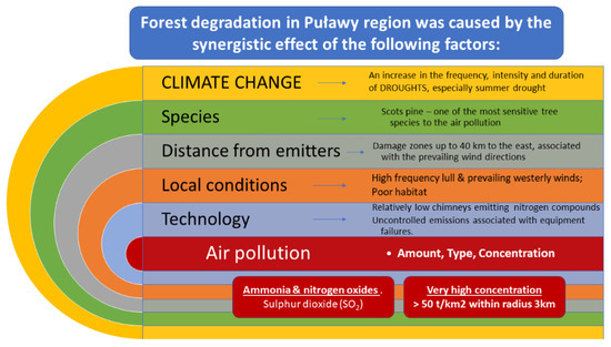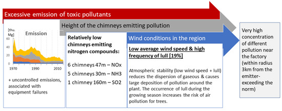 The extent and spatial coverage of forest ecosystem degradation in the Puławy area can be attributed to the amount and type of pollutants and to a number of local factors, especially the anemometric and habitat conditions and the height of the exhaust stacks (Figure 13). The high frequency of periods of lull combined with the low height of the stacks emitting the toxic pollutants multiplied the negative effects of the emissions. A radical reduction in pollutant emissions improved the environmental conditions, enabling the tress to grow once again, but the prolonged period of strong anthropopressure caused a long-term reduction in the trees’ resistance to abiotic factors. Our research indicates that in areas with prolonged exposure to a high concentration of pollutants, the adverse impact of pollution on forests persists for a very long time and may be observed even 20 years after a radical reduction in emissions. These forests have reduced resistance to abiotic stress related to climate change, especially drought. Therefore, a greater impact of climate change—and in particular of extreme events—on the dieback of the trees growing in areas with strong anthropopressure can be expected.