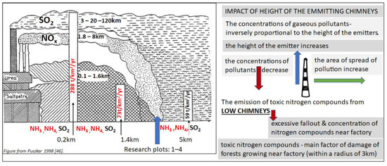We believe that the severe damage to the stands growing around the nitrogen factory in Puławy might have resulted from the synergistic influence of three factors: the emission of toxic substances, the relatively low height of the exhaust stacks that emit nitrogen compounds and the anemometric conditions that prevail in the region (Figure 9). The concentrations of gaseous pollutants are inversely proportional to the height of the emitter. Toxic nitrogen compounds were emitted from six stacks with a height of 47 m (ammonium nitrate) and five stacks with a height of 30 m (gaseous ammonia) [47]. Some of the nitrogen compounds also permeated into the atmosphere from the surface of industrial effluent tanks. The excessive emissions of nitrogen-based pollutants from the relatively low stacks under low wind speed conditions (with an average wind speed of 2.1 m/s) and the frequent periods of lull, especially in summer, resulted in the formation of particularly high concentrations of various pollutants near the factory itself (Figure 10). Consequently, the stands located in the immediate vicinity of the factory suffered the greatest amount of damage, regardless of their location in relation to the prevailing wind direction. Sulphur dioxide was emitted from a 160 metre-tall exhaust stack, which resulted in lower SO2 levels in the vicinity of the nitrogen fertiliser factory itself, but the pollutants were transported over distances of up to 120 km (Figure 10). Therefore, one could conclude that the toxic nitrogen compounds (especially ammonia) were the main factors behind the degradation of the pine stands around Zakłady Azotowe Puławy.