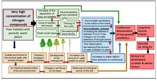 In our opinion, this degradation—as recorded in the annual rings in the form of an abrupt and prolonged reduction in radial growth—is the result of both direct and indirect effects of toxic nitrogen compounds on the entire forest ecosystem. Our concept of this impact is shown in Figure 11. The sudden introduction of very high concentrations of nitrogen compounds into the forest environment caused a rapid, excessive toxic accumulation of nitrogen in pine needles, thus disturbing metabolic processes, causing a failure of the assimilation apparatus and death of apices, and ultimately leading to the dieback of some of the trees [43,44]. This, in turn, resulted in decreased stand density. In some of the pines, the dieback of needles and shoots caused a thinning of the crown. This permitted greater penetration of toxic pollutants and increased deposition of toxins on the needles, which was an ongoing process. At the same time, the decrease in stand density and the thinning of the crown allowed more sunlight to penetrate to the forest floor, causing changes in the microclimate—in particular by increasing the difference between the maximum and minimum air temperature. This entailed an increase in potential evaporation, decrease in mean air moisture level, increase in soil temperature, drying up of the soil, extension of the drought period and increase in water deficit [65].