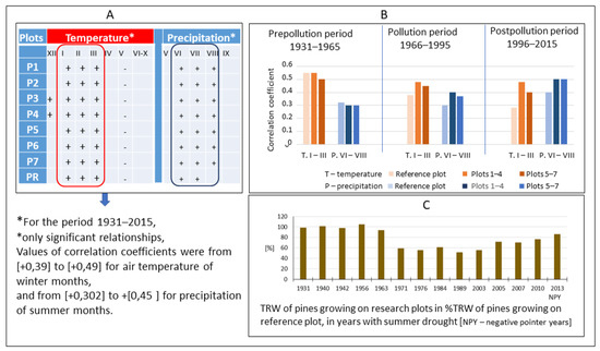 Analyses performed for shorter time periods—covering the years prior to the commissioning of the plant (1931–1965), the years of increased emission of airborne pollutants (1966–1995) and the years of successive reduction in toxic emissions (1996–2015)—demonstrated that the impact of climatic conditions on pine growth was similar in trend for all plots, but differences between the plots in terms of the strength of linkages began appearing in the late 1960s. Interestingly the correlation coefficient between TRW and mean air temperature of winter months decreases over time in the reference plot, while that with summer precipitation increases, witnessing the ongoing climate change with milder winters and drier summers (12B). Pines exposed to toxic pollutants were more vulnerable to cold winters and prolonged summer droughts. The reduction in industrial emissions and improvement of environmental conditions in the last decade of the 20th century resulted in the formation of wider annual rings.