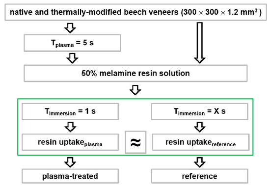 In order to provide a concrete reference to the previously discussed and published studies [9,13], native and thermally modified beech veneers and melamine resin were used in this study. In the context of this study, the term “reference” is used exclusively for the plywood specimens made from non-plasma-pretreated beech veneers, where these veneers remained in the immersion bath until a liquid uptake or WPG (WPG = Weight Percentage Gain) of plasma-pretreated veneers (1 s impregnation time) was achieved. The test matrix for determining the impregnation time required for the reference is depicted in Figure 1. In fact, only comparisons of the plasma-pretreated samples and the reference with the same load will be treated in this study, without including in the tests the references that have the same impregnation time (1 s, with a correspondingly lower load) as the plasma-pretreated samples. The comparisons of the plasma-treated samples with the “regular” references (in the proper sense), where the relevant process parameters (impregnation time of the veneers) remained the same as the parameters of the plasma-treated samples, have already been discussed in detail [9,13].