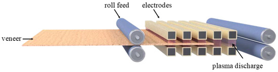 Figure 2 shows the dielectric barrier discharge (DBD) setup used for pretreatment of the veneers. The veneer sheets were transported centrally by a roller conveyor through the gap (5 mm) between two electrode arrays. Each electrode array consisted of five individual electrodes made of rectangular Al2O3 tubes (15 × 15 × 400 mm3; wall thickness = 2.5 mm) filled with bronze powder, with a gap of 5 mm between the individual electrodes of an array [9,13,16]. Two radial fans above and below the electrode arrays generated an ambient air flow towards the electrode arrays (cooling and discharge homogenization). The upper electrode array was connected to a high voltage with alternating polarity and a pulse repetition frequency of 15 kHz (pulse duration = 2 µs) the lower electrode array was grounded. The applied alternating voltage was ~18 kV (peak), leading to a power density of 3.5 W/cm2 for beech veneers and 3.7 W/cm2 for thermally modified beech veneers. During plasma treatment, gas temperatures were measured with a fiber optic thermometer (FTI-10, FISO Technologies, Quebec, Canada) and did not exceed 60 °C.