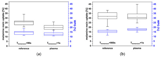 To ensure comparable resin uptake (see Figure 1), the uptake values were determined separately for the plasma-treated samples of native and thermally modified veneers after an impregnation time of 1 s. This value will be referred to as the “target value” in the following. Subsequently, veneers (native and thermally modified) were impregnated without plasma pretreatment until the respective target value was achieved, depending on the veneer type. Figure 3 depicts the melamine resin uptake, as well as the WPG. The impregnation time required for the reference to reach the value of melamine resin uptake or WPG of plasma-pretreated veneers after 1 s impregnation time was approximately 90 s for native beech veneers and approximately 900 s for thermally modified beech veneers. These impregnation times were used in the following to impregnate the wood veneers.