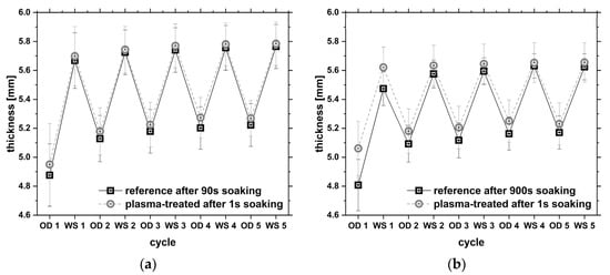 For the plywood specimens made from thermally modified beech veneers (Figure 4b), a difference in terms of thickness swelling as a result of the wet–dry cycling between the reference and the specimens made from plasma-pretreated veneers was observed. In contrast to the samples made from native beech veneers (Figure 4a), the two sample collectives differed significantly in initial thickness. The specimens made from plasma-pretreated veneers obviously showed higher dimensional stability than the reference specimens when undergoing wet–dry cycles.