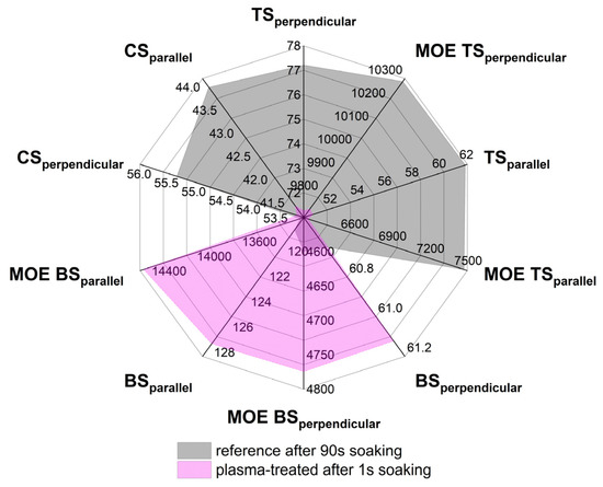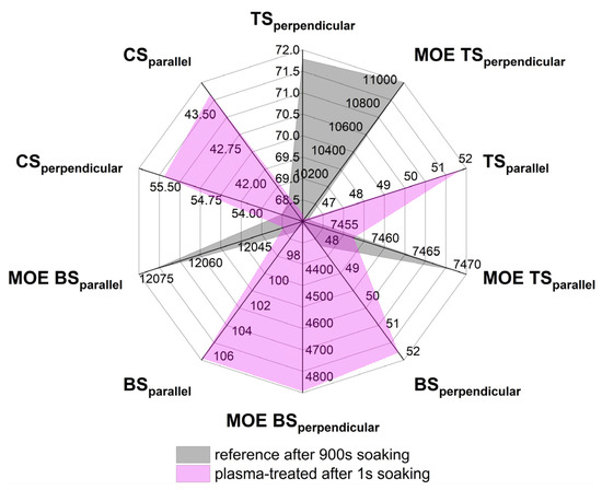 In the case of the plywood samples made from thermally modified veneers, the graph shows higher strength values for TS (parallel to the fiber), BS and MOE BS (perpendicular to the fiber), BS (parallel to the fiber) and CS in both fiber directions. Only for tensile strength and MOE TS (measured perpendicular to the fibers), MOE TS (parallel to the fiber), and MOE BS (parallel to the fiber) does the reference show higher strength values than the plywood made from plasma-treated veneers.