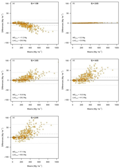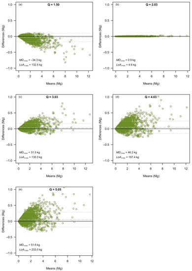 It was confirmed, at the level of individual tree predictions, that the smallest differences between models based on separate variables and models based on combined variables occurred for Dataset Q2 (Q = 2.03, Figure 1b). For Q ≠ 2.0, the smallest differences in absolute values occurred for the smallest trees whereas the largest differences occurred for the largest trees (Figure 1a,c–e). The mean difference (MDtree), which is the average difference of the predicted biomass per tree, was closest to zero (i.e., unbiased) for Q = 2.03 (i.e., 0.9 kg per tree). However, MDtree increased for Q > 2.0, up to 51.6 kg per tree for Dataset Q5. Therefore, for Dataset Q5, the combined variable model estimated, on average, a 51.6 kg heavier tree biomass compared with the separate variable model. This large MDtree was driven by the large differences in large trees, which for Dataset Q5 reached 1357 kg for a tree that had = 6.37 Mg and = 7.73 Mg. As can be observed in Figure 1, for small trees, the differences were relatively small and balanced. For Q < 2.0, the MDtree decreased by up to 34.5 kg per tree (for Q = 1.50). Therefore, for Dataset Q1, the combined variable model predicted, on average, 34.5 kg per tree less compared to the separate variable model.