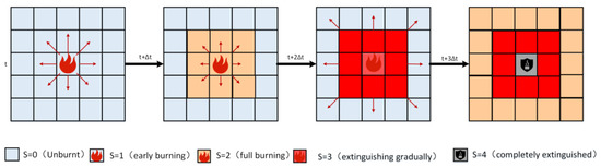 In the forest fire spread geographical cellular automata algorithm, fire units with different geographical burning conditions are located in the geographical cell space. As the discrete time progresses, the state of each cell changes depending on its own state and its neighbors’ states, following the forest fire spreading rules. This procedure is shown in Figure 2.