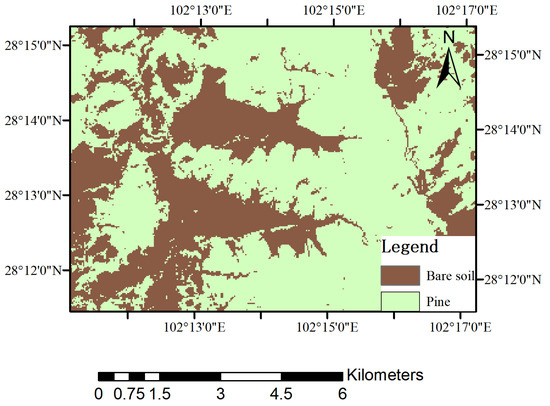 The vegetation coverage in the study area was mainly pine trees. The distribution of combustibles was extracted from the Landsat 8 image for 13 March, using the maximum likelihood supervised classification method. Finally, the study area was divided into two categories: pine and bare soil. Figure 4 shows the combustibles distribution map.
