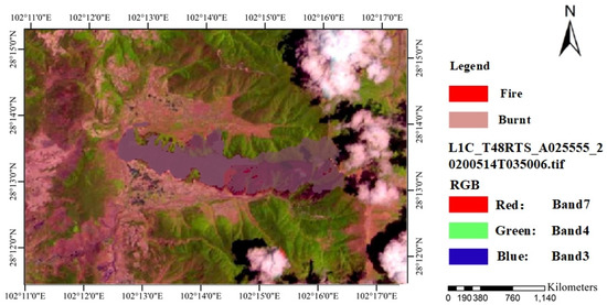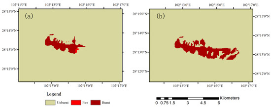 To obtain the initial input data for the fire’s spread, the burnt area and the actively burning area was extracted from the Landsat ETM+ image for 8 May, which was visually interpreted based on various spectral and thermal characteristics as well as smoke. These were used as the input data for the fire spread stimulation, as Figure 5a shows. It is not possible to download two images from the same sensor between 6 May 2020 and 12 May 2020, so the data of the fire’s end situation were obtained through Sentinel-2 image visual interpretation for 14 May, which was used to verify the accuracy of the simulated fire, as Figure 5b shows.