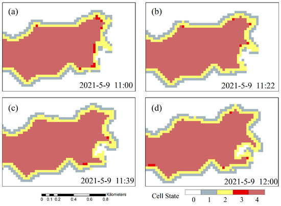 Predicted forest fire spread simulation map for 2021.5.9 11:00–12:00: (a) traditional CA model simulation graph for 9 May 2021, at 11:00; (b) adaptive CA model simulation graph for 9 May 2021, at 11:22; (c) adaptive CA model simulation graph for 9 May 2021, at 11:39; (d) traditional CA model simulation graph for 9 May 2021, at 12:00.