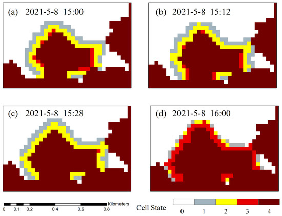 Predicted forest fire spread simulation map for 8 May 2021 19:00–20:00: (a) traditional CA model simulation graph for 8 May 2021, at 19:00; (b) adaptive CA model simulation graph for 8 May 2021, at 19:24; (c) adaptive CA model simulation graph for 8 May 2021, at 19:38; (d) traditional CA model simulation graph for 8 May 2021, at 20:00.
