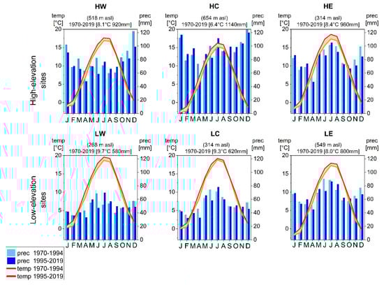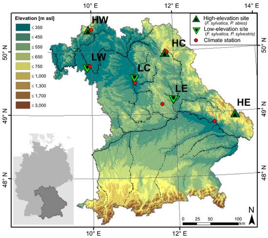 The studied forest sites are located in southeast Germany, in the Free State of Bavaria. Three low- and three high-elevation sites from the middle mountain ranges were chosen for the analysis (Figure 1). As deciduous tree species, European beech (Fagus sylvatica) was selected because it is present at both altitudinal levels, whereas the coniferous tree species Norway spruce (Picea abies) is dominant at high-elevation and Scots pine (Pinus sylvestris) at low-elevation sites. The forests at Bad Brückenau (Rhoen), Wunsiedel (Fichtel Mountains), and Grafenau (Bavarian Forest) represent the high-elevation sites and are all located in Bavarian middle mountain ranges. In the following, we use a combination of symbolic letters for high-elevation (H) and low-elevation (L) sites with their location in the west (W), center (C), or east (E) of the study region, respectively. From west to east, the high-elevation sites are abbreviated with HW for Bad Brückenau, HC for Wunsiedel, and HE for Grafenau, while the low-elevation sites located in basins in the rain shadow of the mountain ranges are called LW for Würzburg, LC for Tennenlohe, and LE for Burglengenfeld (Table 1).