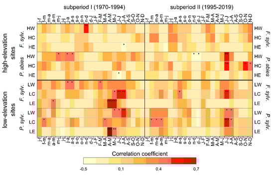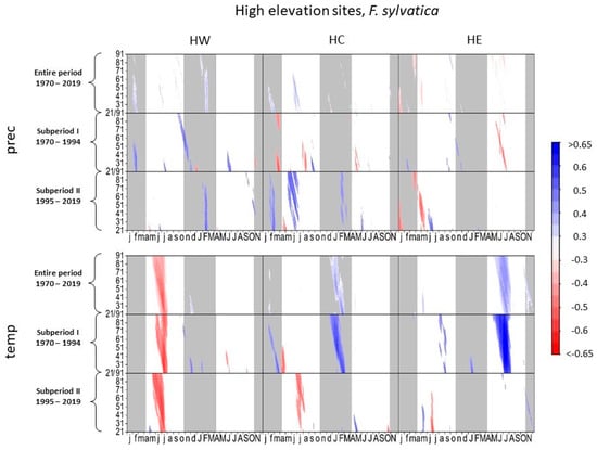 Figure 2 and Figure 3 illustrate the climate–growth relationships considering the months of the previous and current growth year based on daily maximum temperature and precipitation data. Comparing subperiods I and II, the response of beech growth to precipitation changed significantly at high elevations (Figure 2).