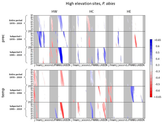 Correlations between daily precipitation/maximum daily temperature and tree-ring width of Picea abies at high-elevation sites. Each value illustrates the beginning of the considered window. Only significant correlation coefficients are shown (p < 0.05). Lower case letters in the abscissa axis represent month of previous growing season, and capital letters indicate the month of the current growing season until November. Grey shading indicates the biologically inactive phase. The ordinate axis displays the window lengths.
