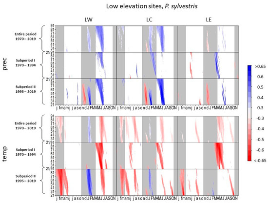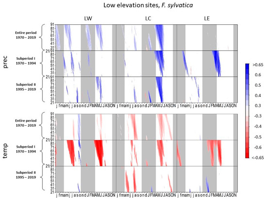Beech negatively correlated to spring and summer temperature at all low elevation sites in subperiod I (Figure 4). However, the negative impact of temperature on tree growth decreased in subperiod II, especially at LW and LE. At these two sites, beech correlated positively to higher temperatures in previous September and October.