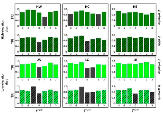 Superposed epoch analysis showing the impact of the extreme drought years 1976, 2003, and 2018 on the tree-ring index (TRI). Dark green bars illustrate high-elevation sites (HW, HC, HE); light green bars show low-elevation sites (LW, LC, LE). Hatching indicates conifers, grey bars indicate significant values with p < 0.05.