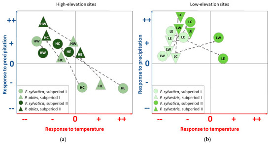 Schematic illustration of the shift in climate–growth relationships between subperiod I (1970–1994) and subperiod II (1995–2019), with respect to precipitation and temperature. (a) Changes for F. sylvatica and P. abies at the high-elevation sites HW, HC, and HE. (b) Changes for F. sylvatica and P. sylvestris at the low-elevation sites LW, LC, and LE.