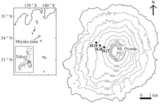 - Kamijo, T.; Kawagoe, M.; Kato, T.; Kiyohara, Y.; Matsuda, M.; Hashiba, K.; Shimada, K. Destruction and recovery of vegetation caused by the 2000-year eruption on Miyake-jima Island, Japan. J. Disaster Res. 2008, 3, 226–235. [Google Scholar] [CrossRef]