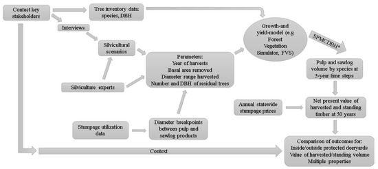 Conceptual model depicting the workflow from qualitative and quantitative input data through the output of the per-hectare value of timberland used in the comparison and interpretation of the impacts of a wildlife policy. SPMCDBH * is the FVS keyword that specifies the diameter cutoff between product classes.
