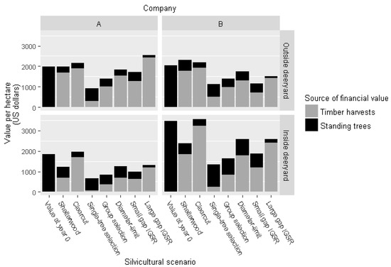 Simple financial returns per hectare of modeled management scenarios of two companies (A,B). The scenarios included activities both outside deeryards (top row of graphs) and inside deeryards (bottom row of graphs) separately, due to differences in the starting conditions. Each bar represents the total value of the trees on one hectare for a given management option and is composed of harvest revenue (total returns from all entries within 50 years with the first entry at year 0; grey portion of bar) and standing value (stumpage value of standing timber at the end of the 50-year simulation; black portion of bar). The first bar in each panel represents the value of the starting inventory tree list before any harvests were modeled. “IGSR” represents the irregular group shelterwood with reserves system. Data in Appendix A.