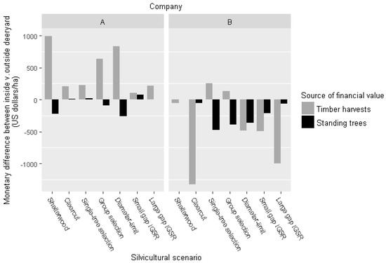 Differences in revenue per hectare between “business as usual” management scenarios and those applied within protected deeryards (PDs) of two companies (A,B) (for example, the first bar in each panel represents the value from harvested timber of a “business as usual” shelterwood minus the harvest value of a shelterwood modified for PDs, using inventory data from each company; each of the two panels corresponds to a company). The harvest revenue (gray bars) is the total returns from all entries within 50 years with the first entry at year 0; the standing value (black bars) is the stumpage value of standing timber at the end of the 50-year simulation. Positive bars indicate greater revenue outside PDs; negative bars indicate greater revenue inside PDs. “IGSR” represents the irregular group shelterwood with reserves system. Data in Appendix B.