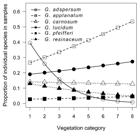 Proportion of individual Ganoderma species along the vegetation category gradient. The positions of points are predicted from the binomial generalized linear mixed model.