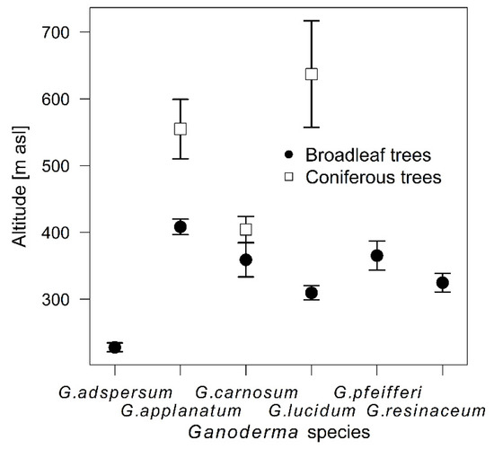 Ganoderma samples from softwoods had higher average altitude than samples from hardwoods. This could be obviously caused by the fact that softwood and hardwood trees vary in their abundances in relation to altitude and thus, uneven chance to sample coniferous and deciduous trees along the altitudinal gradient could be expected.