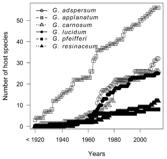 For the complex of studied species, we revealed a very broad host-range including at least 69 host species (belonging to 36 genera). Moreover, from species accumulation curves it can be expected, that in the next years, more host association could be observed. At species level we can observe a major change in the number of newly discovered associated tree species from the 1960s to 1980s which might have been caused by (i) a new law that entered in 1959 which led to a dynamic increase in enriching museum’s collections during those years or (ii) it might be connected to declining quality of environment when Ganoderma species had more opportunities to colonize new host trees. Host expansion tendency was previously observed for example in mistletoe [68] which may happen through introduction of new hosts to a new area or as a result of evolutionary pressures [69,70] originating from habitat and climate changes [71,72]. There are also several studies that focused on diversity of wood fungi under varying environmental factors and their influence on host plant [73,74,75]. Based on AICc of set of models, we found that the best simplification of host preference is at the genus level. According to the range of attacked tree genera we can split Ganoderma species into two groups, those with: (i) lower host plasticity including G. resinaceum, G. lucidum and G. pfeifferi and (ii) with higher host plasticity including G. applanatum, G. adspersum and G. carnosum, showed also by genera accumulation curves.