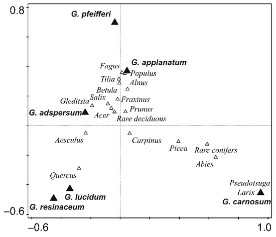 CCA analysis plot showing the differences in host tree composition among Ganoderma species and affiliation of them to host genera.