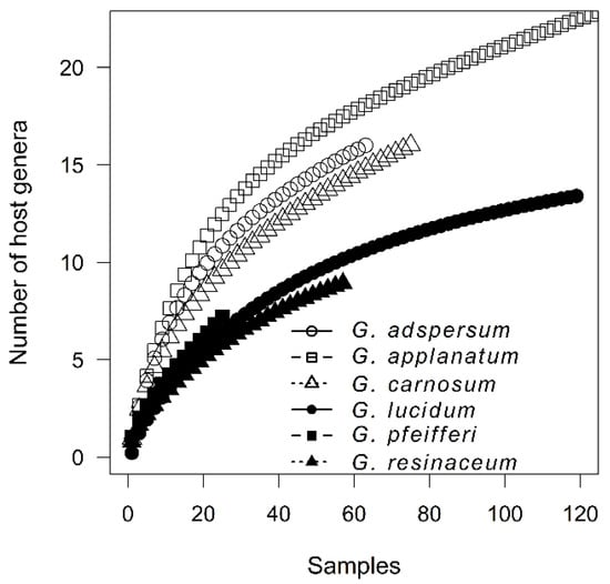 Genera accumulation curves showing the level of host specificity of individual Ganoderma species. The axes shortened for clarity.