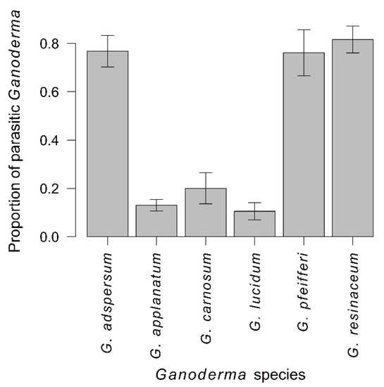 Proportion of parasitic samples in individual Ganoderma species (mean ± SE).