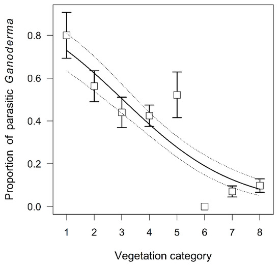 Proportion of parasitic Ganoderma samples along the vegetation category gradient (mean ± SE), the trend is predicted from binomial generalized linear model.