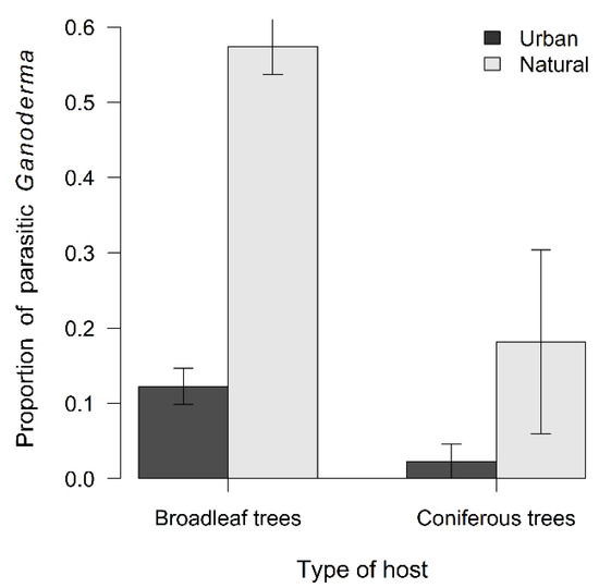 Proportion of parasitic Ganoderma samples in urban or natural environment and on broadleaf or coniferous trees (mean ± SE).