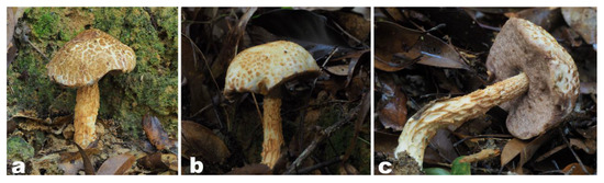 Basidiomata of Austroboletus brunneisquamus ((a) from FHMU5875; (b,c) from FHMU5876, holotype). Photos by Y.G. Fan.