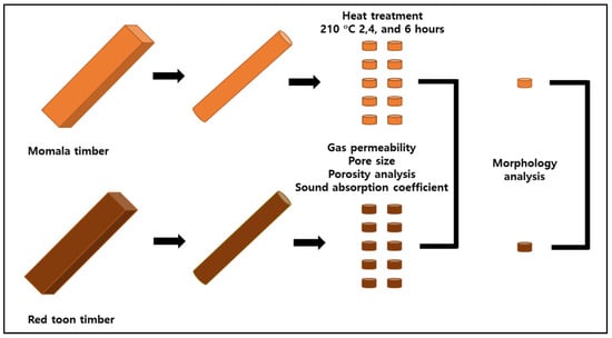 In this study, the heat treatment temperature of 210 °C was selected as it is known to produce high weather resistance against decaying bacteria with only a marginal decrease in strength [27]. Indonesian momala (Homalium foetidum (Roxb.) Benth.) and Korean red toon (Toona sinensis (A. Juss.) M. Roem.) were selected because they are permeable and readily available. The heat treatment time ranged from 0 to 6 h. An air back cavity of 0 to 3 cm was created because the sound absorption performance of a porous material improves at low frequencies [28,29,30]. Porosity analysis was conducted based on heat treatment time, and gas permeability and pore size were measured to assess the effects of these changes on sound absorption performance.