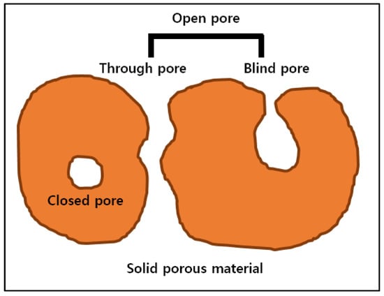 Figure 2 shows the classification of solid porous materials. The International Union of Pure and Applied Chemistry (IUPAC) stated in their 1994 publication Recommendations for the Characterization of Porous Solids (Technical Report) [40] that the physical pore shape of a solid porous material is classified into three types: through-pores with both ends open, blind pores with one end open, and closed pores without communication to the outside of the material. The combination of a through-pore and a blind pore is called an open pore.