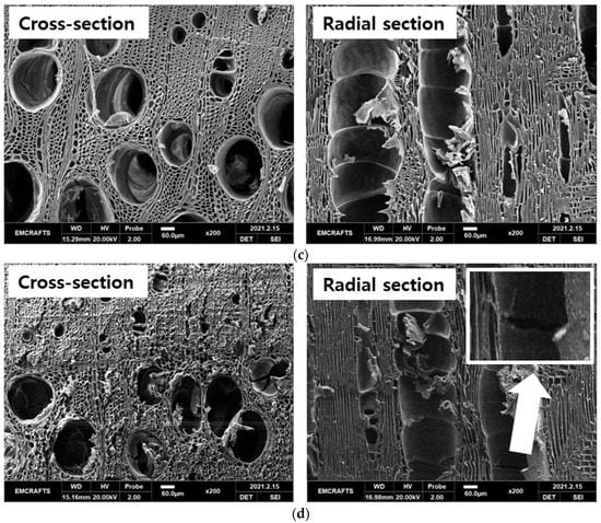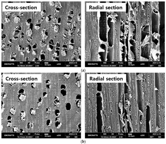 The SEM (Genesis-1000; EmCrafts Co., Ltd., Sungnam, Korea) was used to observe the changes in wood morphology before and after heat treatment. The specimens were pretreated by softening and drying before SEM measurement [25,31]. The cross sections and radial sections of each species were observed at 200×.